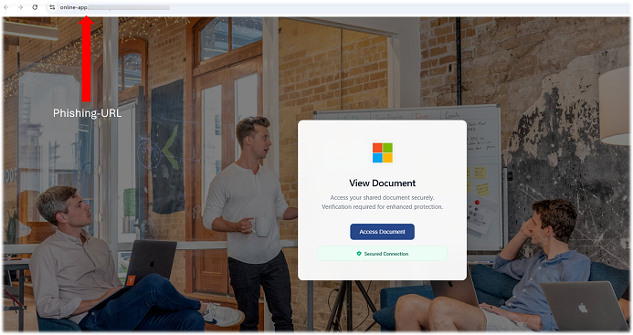 Möchten Sie nun die vermeintliche PDF-Datei öffnen und klicken auf „Dokument ansehen“ werden Sie auf eine täuschend echt aussehende Microsoft-Webseite weitergeleitet. An dieser Stelle werden Sie aufgefordert, den Prozess zu verifizieren. Dabei wird der Eindruck erweckt, es handle sich um einen legitimen Sicherheitsvorgang, um die (vermeintliche) Authentizität zusätzlich zu unterstreichen. Die URL ist in diesem Fall teils zensiert, aber wie Sie an dem sichtbaren Ausschnitt erkennen können, befinden Sie sich nicht auf einer echten Microsoft-Webseite.
