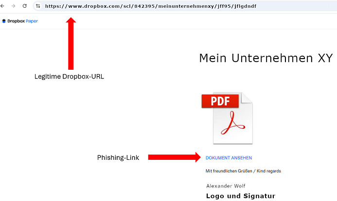 Der im OneDrive-Bild eingebettete Link leitet Sie auf eine Dropbox-Seite weiter. Dies ist ein deutliches Warnsignal, da es sich um zwei verschiedene Cloud-Sharing-Dienste handelt. Die Dropbox Links werden bzw. können je nach eingesetzter Erkennungssoftware nicht „immer“ als maliziös/betrügerisch eingestuft/erkannt werden. Der Inhalt des Dropbox-Links wirkt authentisch und fordert Sie auf das Dokument anzuklicken/anzusehen.