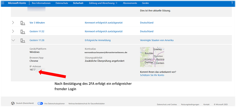 Ab hier haben die Cyberkriminellen viele Möglichkeiten das Konto zu kontrollieren. Oft werden im nächsten Schritt die 2FA deaktiviert und/oder neue Geräte hinzugefügt, um eine eigene Authentifizierung einzurichten. Da die Täter das Konto möglichst unbemerkt missbrauchen möchten, wäre ein vollständiges Aussperren (z. B. neues Kennwort) kontraproduktiv, da dieser Schritt auffällt und unter Umständen eine Kontosperrung zur Folge hätte. (Je nach eingesetzten Monitoring-Tools, M365 Produkte…)