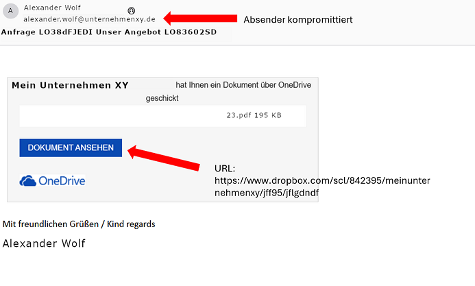 Sie erhalten eine angebliche OneDrive Benachrichtigung, mit dem Hinweis, dass evtl. Ihr Kunde, Personal etc. Ihnen ein Dokument geschickt haben soll. Hierzu sollen Sie einfach das verlinkte Bild anklicken. I. d. R. erhalten Sie diese Mail bereits von einem kompromittierten Postfach.