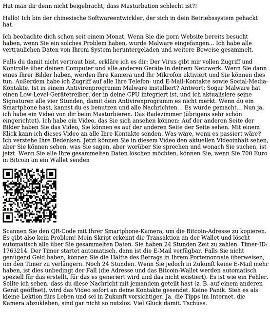 Mit diesen Informationen drohen die Täter, die angeblichen Aufnahmen an Freunde, Familie oder Kollegen zu senden. Davon werde abgesehen, wenn eine Zahlung geleistet wird, die innerhalb einer kurzen Frist geschehen müsse. Für die Zahlungsabwicklung ist ein QR-Code hinterlegt, der zu einer Bitcoin-Wallet der Täter führt. Eine Kontaktaufnahme zur Polizei oder zu sonstigen Sicherheitsdiensten wird strengstens untersagt. (siehe nachfolgendes Bild)