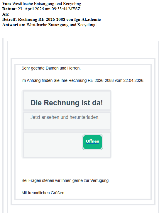 Nach wie vor ist die E-Mail der einfachste Verbreitungsweg für solche Angriffe. In diesem Fall wurde eine vermeintliche Rechnung mit einem verlinkten Button versendet.
