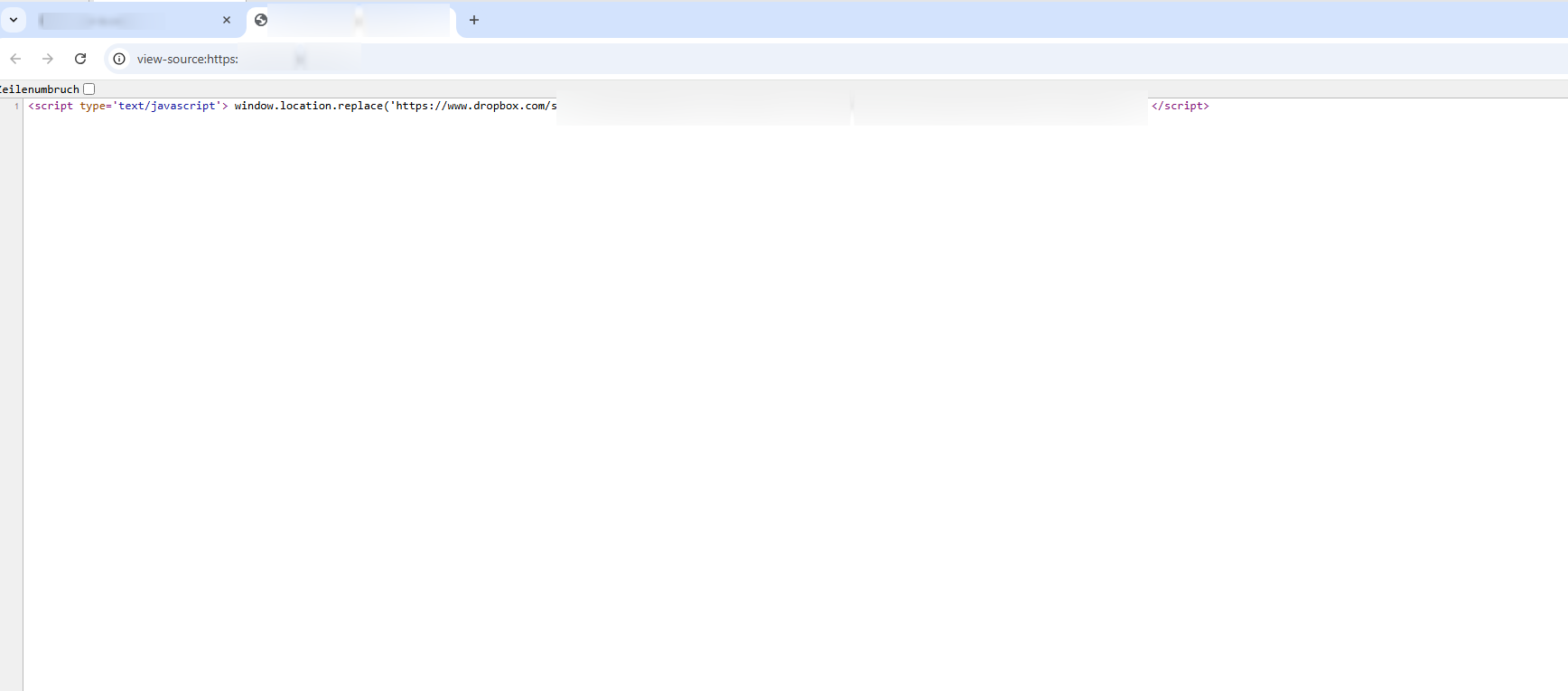 Der Webseiten-Quelltext zeigt, dass die Datei über einen externen Dienst geladen wird (hier Dropbox). Angreifer nutzen solche Dienste oft, um durch die hohe Vertrauenswürdigkeit diverse Filtersystem zu umgehen.